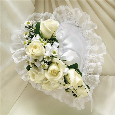 •Heart-shaped satin casket pillow is adorned with a spray of white roses, baby’s breath, ribbon and soft, lush greenery